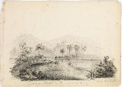 Título centralizado abaixo do desenho, na margem inferior do papel, a grafite: "Pouso do Jatobá, na Provincia de Goyaz.".